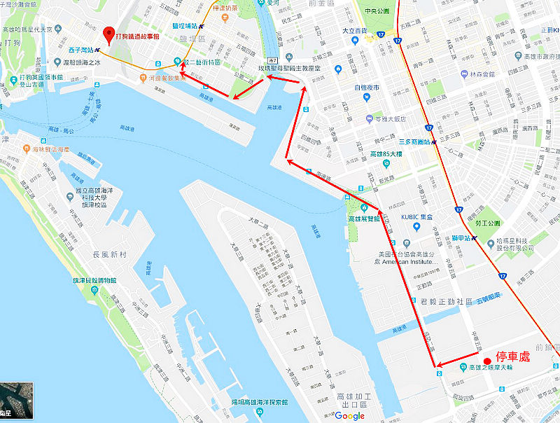 駁二藝術特區、真愛碼頭、舊鐵軌、光榮碼頭、新光碼頭、統一夢時代