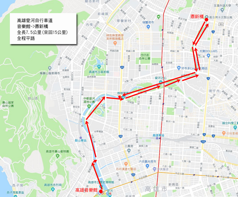 樓主 歷史悠久的愛河自行車道,沿著河道騎行,等於是橫跨整個高雄市區,市政府在車道旁設置許多造景,同時也是高雄人散步的好地方,可惜沿途必須經過許多市區幹道,騎單車反而走走停停,而且等紅燈就要等很久,如果能夠多蓋幾個陸橋或隧道,對休閒的高雄市民會是一大福音!